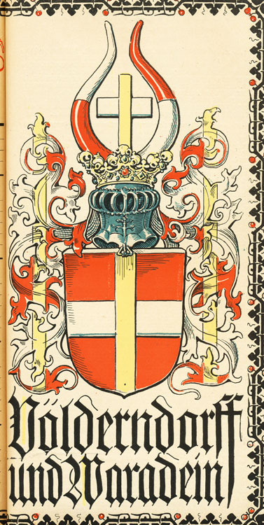 Völderndorff und Waradein In Rot ein silberner Balken, darüber ein schmaler goldener Pfahl, auf dem gekrönten Helm mit rot-silbernen Decken ein Hochkreuz mit silbernem Querbalken und goldenem Pfahl zwischen einem silbern-rot übereck geteilten Paar Büffelhörner. Die goldenen Pfähle auf den Helmdecken sind künstlerische Freiheit und gehören nicht zum Wappen. |