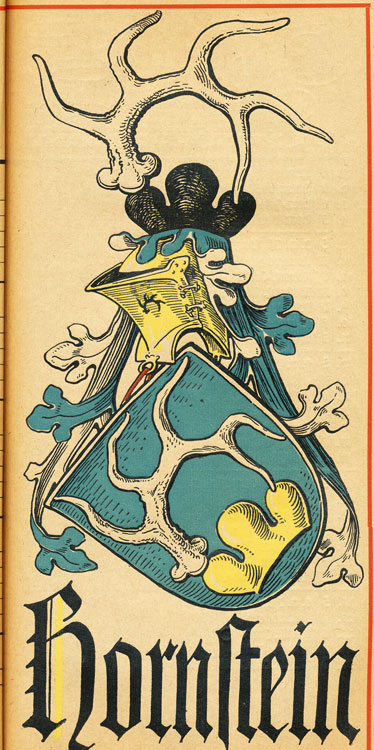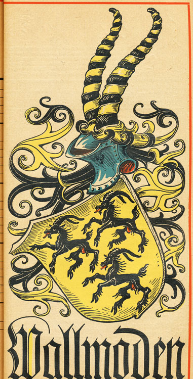 In Gold drei (2:1) aufspringende schwarze Böcke, auf dem ungekrönten Helm mit golden-schwarzen Decken zwei schwarze, spiralförmig mit einem goldenen Band umwundene Bockshörner. |