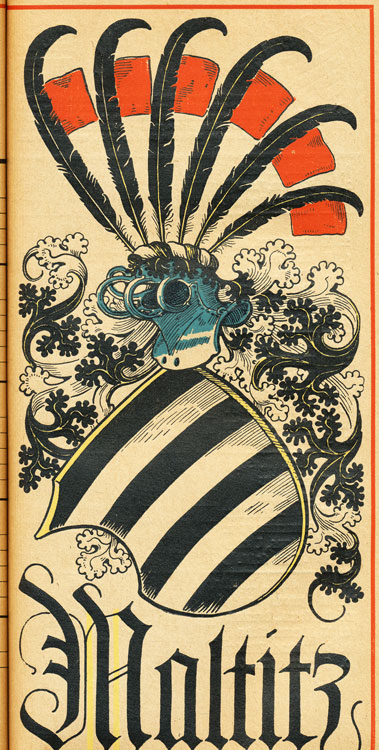 von Maltitz Von Schwarz und Silber siebenmal geteilt, auf dem schwarz-silbern bewulsteten Helm mit schwarz-silbernen Decken fünf schwarze Hahnenfedern, an denen rote Fähnchen nach hinten abwehen. |