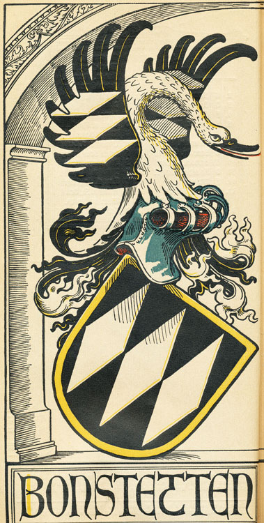 Bonstetten Innerhalb eines goldenen Fadenbordes in Schwarz drei silberne, aneinander anstoßende Rauten nebeneinander, auf dem ungekrönten Helm mit schwarz-silbernen Decken ein silberner Schwan mit erhobenen schwarzen und mit den drei Rauten belegten Flügeln wachsend. |