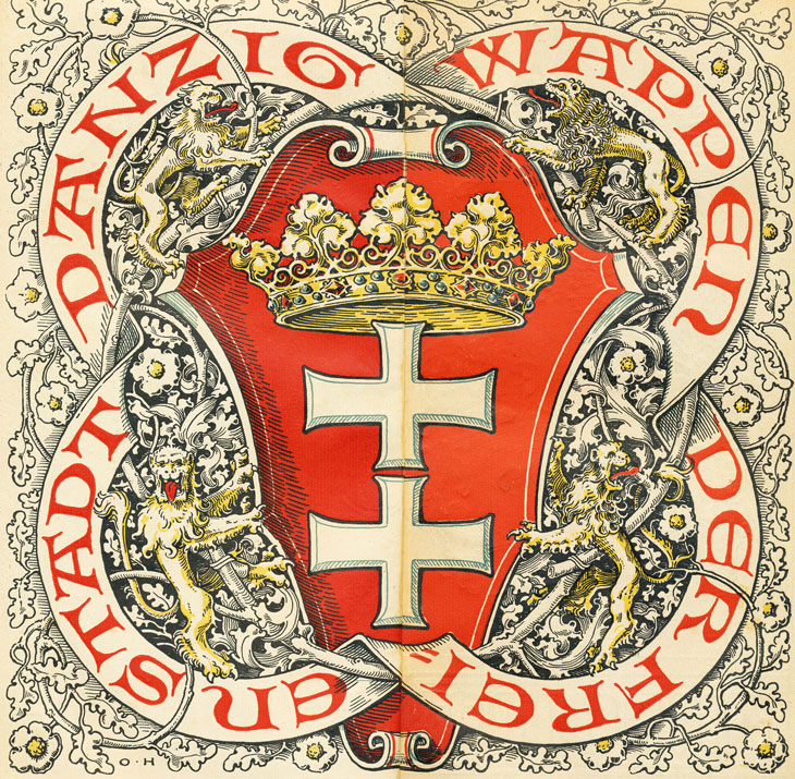 freien Stadt Danzig In Rot zwei schwebende silberne Tatzenkreuze übereinander, überhöht von einer goldenen Laubkrone. Danzig wurde 1920 aufgrund der Festlegungen des Versailler Vertrages vom Reichsgebiet abgespalten und unter dem Namen "Freie Stadt Danzig" zu einem eigenständigen Staat, einem autonomen Freistaat, der bis 1939 bestand. Nach dem Überfall auf Polen wurde der Zustand beendet und Danzig dem Reichsgau Danzig-Westpreußen eingegliedert. Das Wappen des Freistaates wurde im Art. 2. der Verfassung vom 17.11.1920 festgelegt, ist aber in ähnlicher Form bereits seit 1410 belegt. Anstelle der Tatzenkreuze sind auch einfache griechische Kreuze mit geraden, nicht verbreiterten Abschlüssen üblich. |