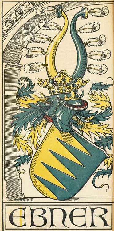 Eschenbach Mit Spitzen von Blau und Gold gespalten (hier gewendet), auf dem gekrönten Helm mit blau-goldenen Decken ein Paar Büffelhörner, das rechte blau, das linke golden, beide mit Mündungen in Gegenfarbe und außen mit je fünf silbernen Straußenfedern besteckt. |