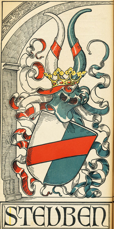 | von Steuben Blau-silbern gespalten mit einem roten Schrägbalken (Schrägrechtsbalken), auf dem gekrönten Helm mit rot-silbernen und blau-silbernen Decken ein Paar Büffelhörner, das eine silbern mit rotem Schrägrechtsbalken, das andere blau mit rotem Schräglinksbalken. Das Wappen ist gewendet. |