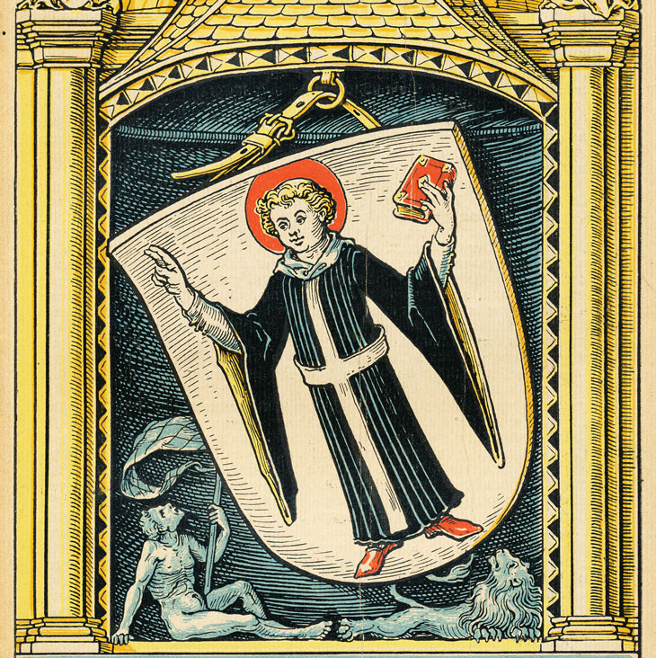 Stadt München Das kleine Wappen der Stadt München zeigt in Silber einen stehenden Mönch mit schwarzer Kutte, silbernem Besatz und ebensolcher Kapuze und mit roten Schuhen, der ein rotes Buch in der Linken hält und die Rechte segnend erhoben hat. Heute ist die Bordierung golden. Daneben führt die Stadt München auch noch ein großes Wappen: In Silber ein offenes rotes Stadttor zwischen zwei roten Zinnentürmen mit von Schwarz und Gold mehrfach zickzackartig gebänderten Dächern; oben ein wachsender, golden gekrönter und bewehrter goldener Löwe; im Tor der Mönch des kleinen Wappens. Hier wird die Titelseite wiedergegeben, weil die Anfangsdoppelseite lediglich Studien zur Form des Adlers enthält. |
