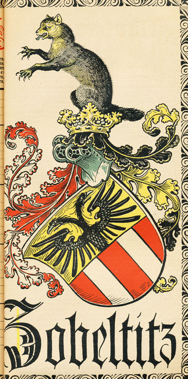 von Zobeltitz Geteilt, oben in Gold ein wachsender schwarzer Doppeladler, unten in Rot zwei silberne Pfähle, auf dem gekrönten Helm mit rechts silbern-roten und links schwarz-goldenen Decken ein natürlicher Zobel. |