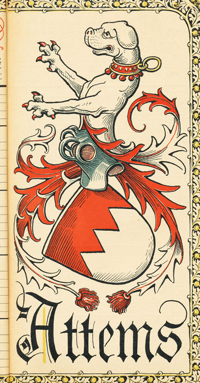| von Attems Rot-silbern mit drei Spitzen geteilt, auf dem ungekrönten Helm mit silbern-roten Decken eine wachsende, silberne Bracke mit roter Bewehrung und mit rotem, golden gesäumten Halsband mit goldenem Ring. |