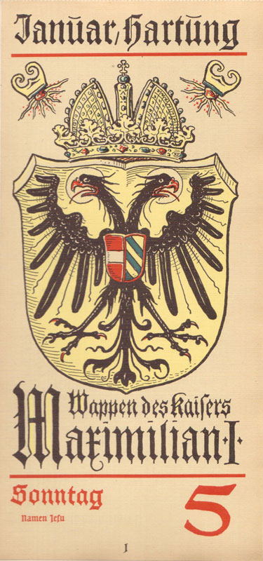 Maximilian I. In Gold ein schwarzer, rotbewehrter und golden nimbierter Doppeladler (Reichsadler), auf der Brust belegt mit einem gespaltenen Schildchen, rechts in Rot ein silberner Balken (Erzherzogtum Österreich), links innerhalb eines roten Bordes fünfmal golden-blau schräggeteilt (Burgund). Auf dem Schildrand die Kaiserkrone des Heiligen Römischen Reichs, in den oberen Ecken des Blattes zwei funkensprühende Feuerstähle. |