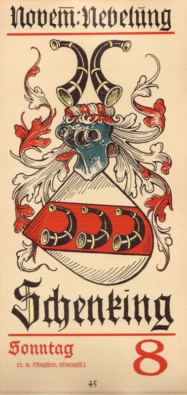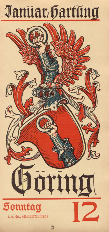 Göring In Rot ein aufrechter, gerüsteter Rechtsarm, in der bloßen Hand einen silbernen Ring haltend, auf dem rot-silbern bewulsteten Helm mit rot-silbernen Decken ein wachsender, leicht angewinkelter, aufrechter, gerüsteter Rechtsarm, in der bloßen Hand einen silbernen Ring haltend, zwischen einem roten Flug. |