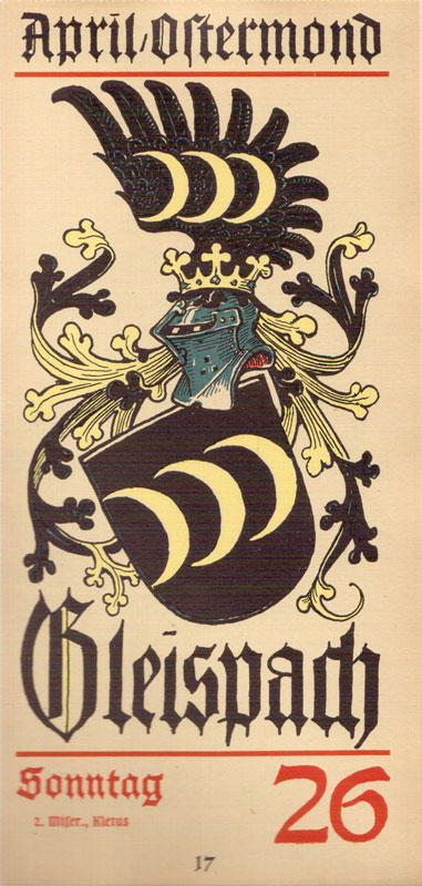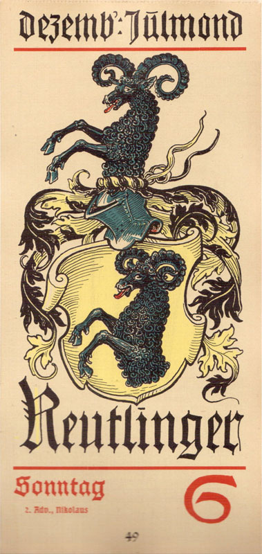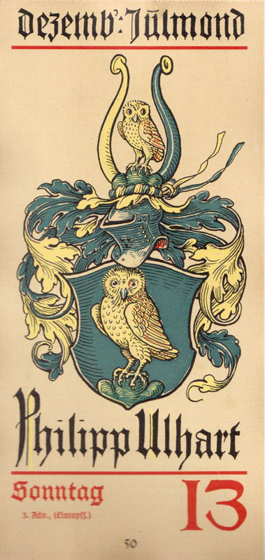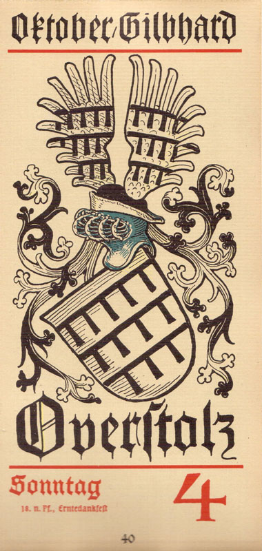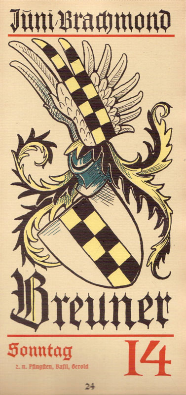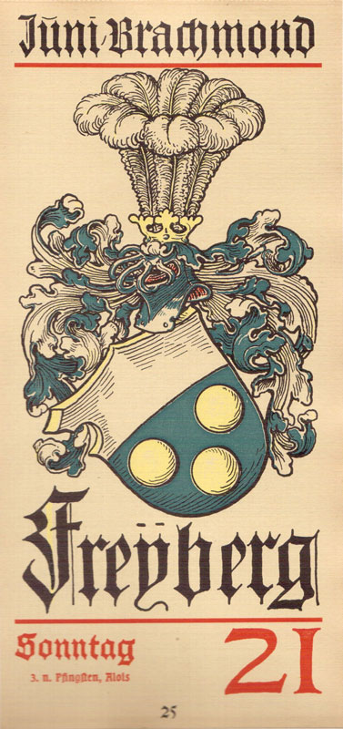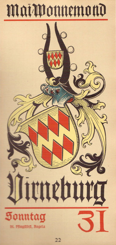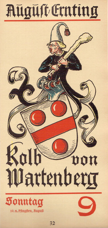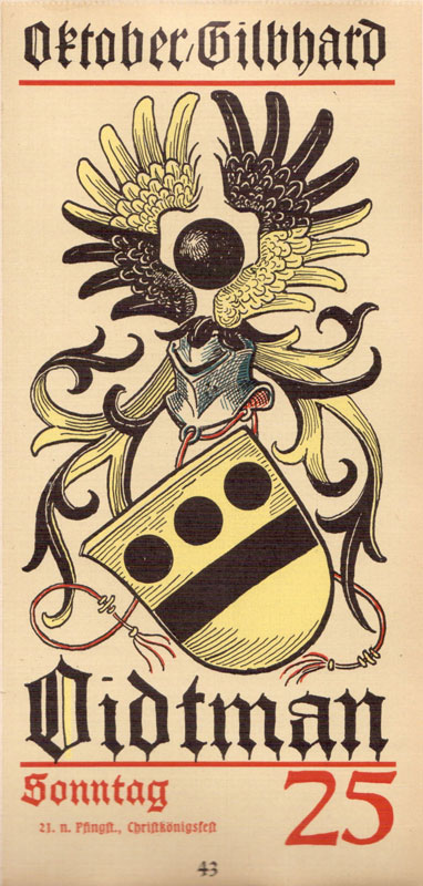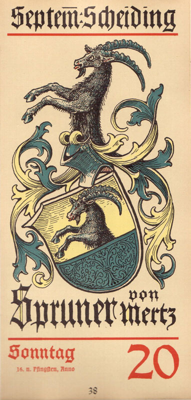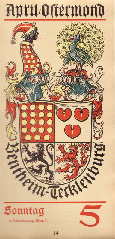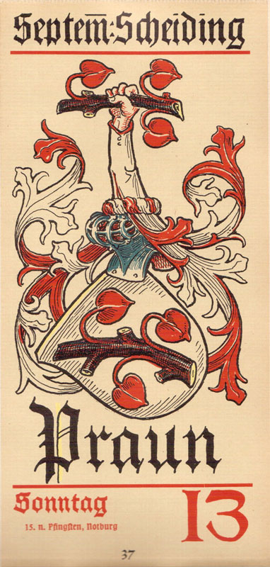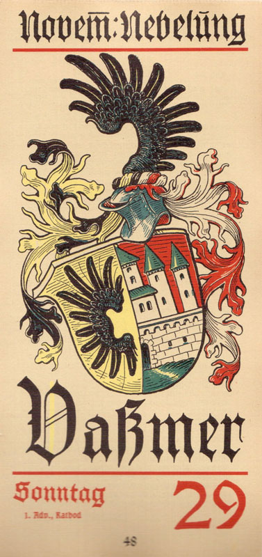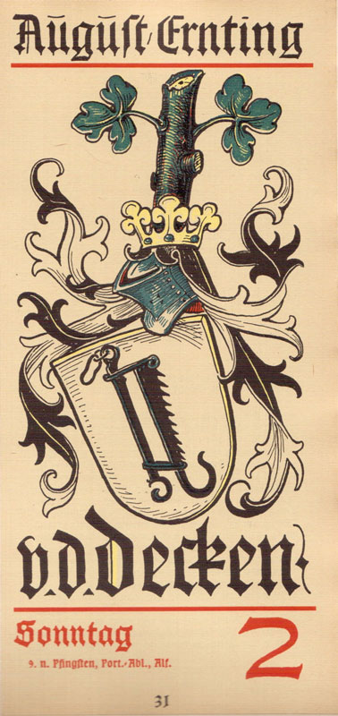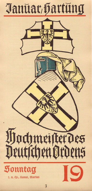 des Deutschen Ordens In Silber ein durchgehendes schwarzes Kreuz, belegt mit einem goldenen Kreuz mit kurzen balkenförmigen stumpfen Enden, in der Mitte ein goldenes Herzschildchen mit einem schwarzen Adler, auf dem Helm mit hier goldenen (normalerweise schwarz-silbernen) Decken ein silbernes Schirmbrett, das mit dem Hochmeisterkreuz belegt ist. Auf den nachfolgenden Blättern sind viele Familien mit ihren Wappen vertreten, die einen Bezug zum Deutschen Orden und zum Hochmeistertum haben. |