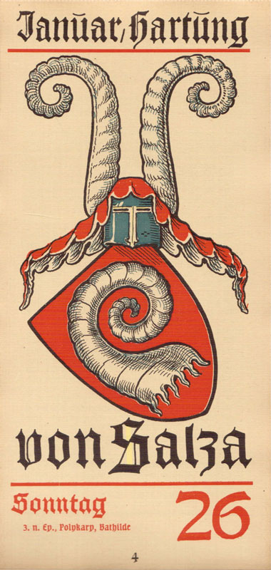 von Salza in Rot ein silbernes Ammonshorn (eingedrehtes Steinbockshorn), auf dem Helm mit rot-silbernen Decken zwei silberne Ammonshörner. Im Kontext ist hier die Familie von Hermann von Salza gemeint, Hochmeister des Deutschen Ordens 1210-1239. |