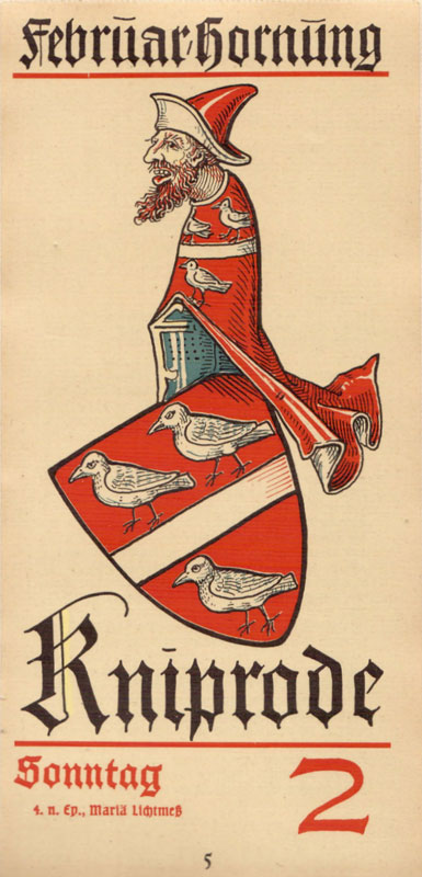 | von Kniprode In Rot ein silberner Balken zwischen drei (2:1) silbernen Vögeln, auf dem ungekrönten Helm mit rot-silbernen Decken ein wachsender bärtiger Mannesrumpf, das rote Gewand mit dem Schildbild belegt, auf dem Kopf eine rote, silbern aufgeschlagene Spitzmütze. Im Kontext ist hier die Familie von Winrich von Kniprode (Knipenrode) gemeint, Hochmeister des Deutschen Ordens 1352-1382. |