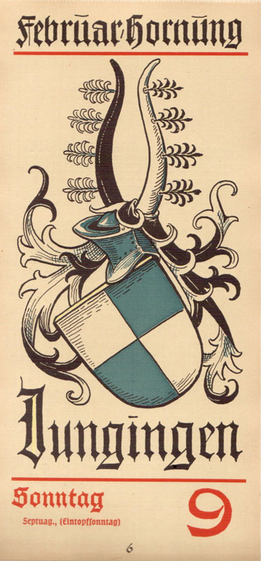 von Jungingen Silbern-blau geviert, auf dem Helm mit schwarz-silbernen Decken ein Paar Büffelhörner, das rechte schwarz und außen mit vier silbernen Hahnenfederbüscheln besteckt und das linke silbern und außen mit vier schwarzen Hahnenfederbüscheln besteckt. Im Kontext ist hier die Familie von Konrad von Jungingen und Ulrich von Jungingen gemeint, Hochmeister des Deutschen Ordens jeweils 1393-1407 und 1407-1410. |