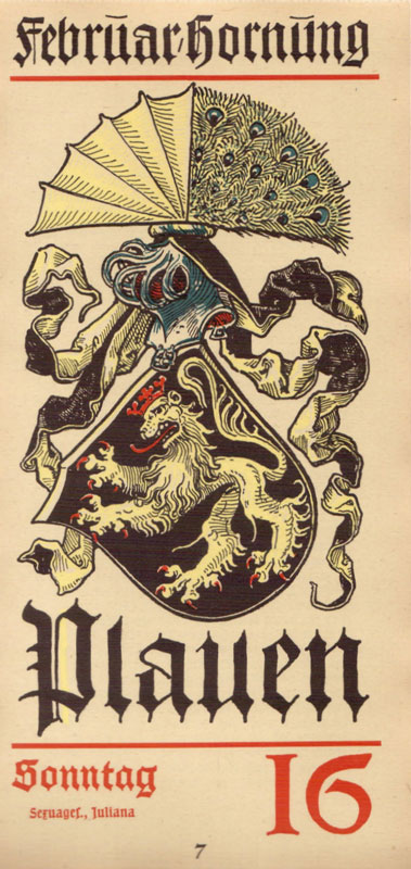 | von Plauen In Schwarz ein rotbewehrter und -gezungter, rot gekrönter goldener Löwe, auf dem Helm mit schwarz-goldenen Decken ein fächerförmiges Schirmbrett, gespalten, vorne golden, hinten Pfauenfedern. Im Kontext ist hier die Familie von Heinrich von Plauen gemeint, Hochmeister des Deutschen Ordens 1410-1413. |