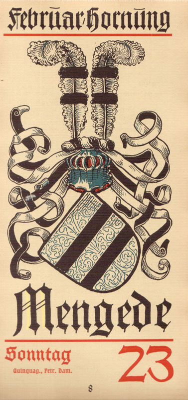 von Mengede In Silber zwei schwarze Balken, auf dem schwarz-silbern bewulsteten Helm mit schwarz-silbernen Decken zwei silberne Straußenfedern, belegt jeweils mit zwei schwarzen Balken. Im Kontext ist hier die Familie von Johann von Mengede (Johann von Mengden, genannt Osthof) gemeint, der 1442-1450 Komtur von Reval war und 1450-1469 Landmeister des Deutschen Ordens in Livland. |