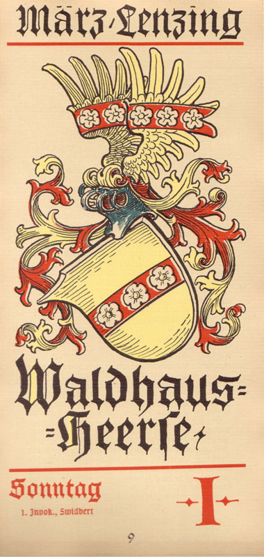 Waldhaus-Heerse In Gold ein roter, mit drei silbernen Rosen belegter Balken, auf dem Helm mit rot-goldenen Decken ein goldener Flug, beiderseits bezeichnet mit einem roten, mit drei silbernen Rosen belegten Balken. Im Kontext ist hier die Familie von Johann Waldhaus von Heerse (Wolthus von Herse) gemeint, der 1470-1471 Landmeister des Deutschen Ordens in Livland war. |