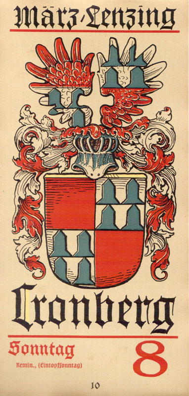 von Cronberg Geviert, Feld 1 und 4 rot und ledig, Feld 2 und 3: in Silber vier (2:2) blaue Eisenhütlein (Eisenhutfeh), auf dem ungekrönten Helm mit rot-silbernen Decken ein insgesamt wie der Schild bezeichneter Flug. Im Kontext ist hier die Familie von Walther von Cronberg gemeint, Hochmeister des Deutschen Ordens 1527-1543. |