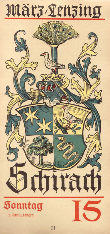 | von Schirach Geviert, Feld 1: In Blau zwei goldene sechszackige Sterne schrägbalkenweise, Feld 2: in Gold eine silberne, rotbewehrte Taube auf einem grünen beblätterten Olivenbaumast sitzend, Feld 3: in Silber auf grünem Boden ein natürlicher grüner Baum, Feld 4: in Blau eine gewundene goldene Schlange, auf dem gekrönten Helm mit blau-goldenen Decken eine silberne, rotbewehrte Taube vor einer blauen Säule, die oben einen naturfarbenen Pfauenfederbusch trägt. |