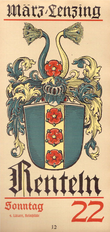 von Renteln In Blau ein goldener Pfahl, belegt mit drei roten Rosen mit goldenem Butzen und grünen Kelchblättern, auf dem Helm mit rechts golden-blauen und links blau-goldenen Decken eine rote, golden bebutzte Rose mit grünen Kelchblättern zwischen einem Paar Büffelhörner, das rechte blau, das linke golden, in den Mündungen jeweils mit drei Pfauenfedern besteckt. |