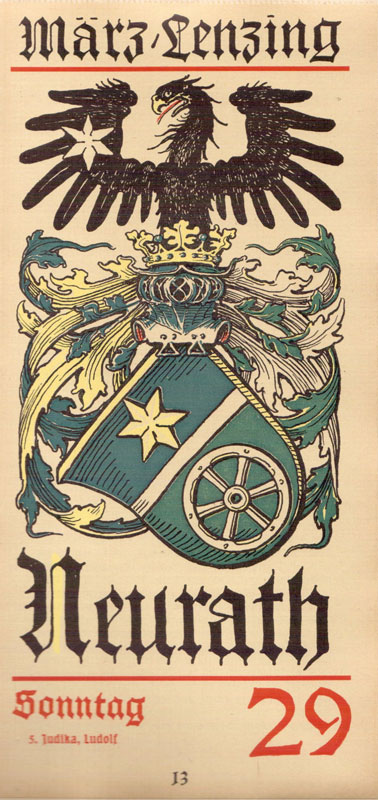 | von Neurath Durch einen silbernen Balken von Blau und Grün geteilt, oben ein sechsstrahliger goldener Stern, unten ein silbernes sechsspeichiges Rad, auf dem gekrönten Helm mit rechts blau-goldenen und links grün-silbernen Decken ein wachsender schwarzer Adler, dessen rechter Flügel (Lit.: blau) mit einem eigentlich goldenen, hier silbernen Stern belegt ist. |