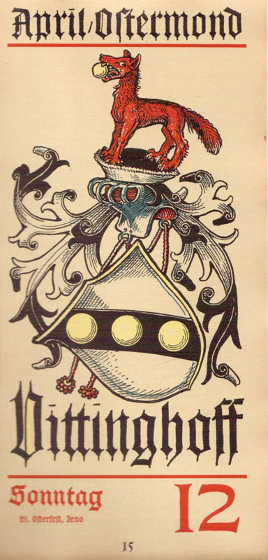 Vittinghoff In Silber ein schwarzer Schrägbalken (Schrägrechtsbalken), mit drei goldenen Kugeln (Scheiben) belegt, auf dem Helm mit schwarz-silbernen Decken ein schwarzer, silbern aufgeschlagener Turnierhut, darauf ein stehender roter Fuchs mit einer goldenen Kugel im Maul. |
