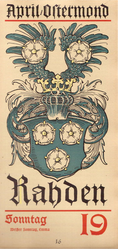 von Rahden In Blau drei (2:1) silberne Rosen, golden bebutzt und mit goldenen Kelchblättern, auf dem gekrönten Helm mit blau-silbernen Decken ein blauer Flug, beiderseits belegt mit einer silbernen Rose. |