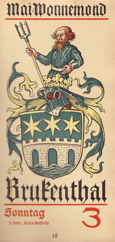 Brukenthal In Blau über einem Wellenschildfuß eine silberne Brücke mit drei Brückenbögen und gezinnter Mauerkrone, darüber balkenweise drei goldene sechszackige Sterne, auf dem gekrönten Helm mit blau-goldenen Decken wachsend ein blau gekleideter, bärtiger, barhäuptiger Mann, in der Rechten einen Dreizack mit goldenem Stiel haltend, die Linke an der silbernen Leibbinde. |