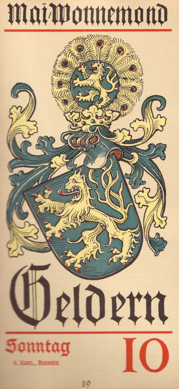 | von Geldern In Blau ein goldener, rotgezungter und ebenso bewehrter Löwe, auf dem gekrönten Helm mit blau-goldenen Decken eine blaue, mit dem goldenen Löwen belegte Scheibe, die ringsum mit Pfauenspiegeln besteckt ist. |