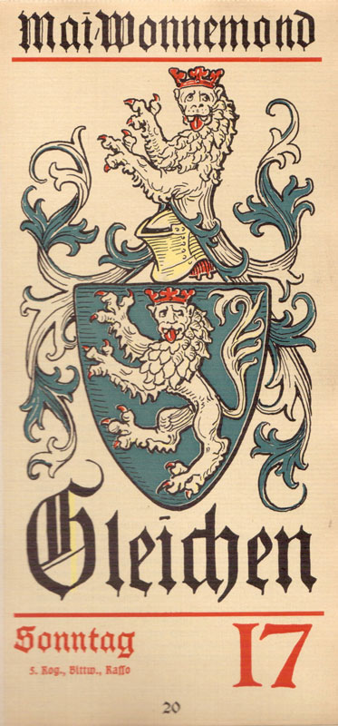 von Gleichen In Blau ein silberner, rot gekrönter, und ebenso gezungter und bewehrter, hersehender Löwe, auf dem Helm mit silbern-blauen Decken ein wachsender, silberner, hersehender Löwe wie im Schild. |