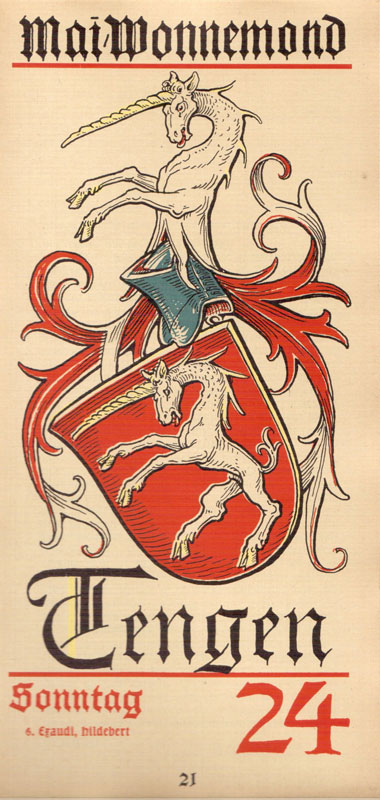 | von Tengen In Rot ein silbernes, aufspringendes, golden bewehrtes Einhorn, auf dem ungekrönten Helm mit silbern-roten Decken wachsend ein silbernes, golden bewehrtes Einhorn. |