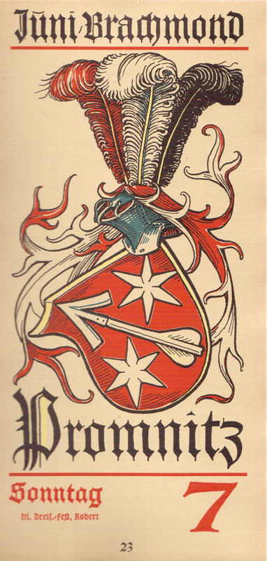 | von Promnitz In Rot ein silberner, schräggestellter Pfeil zwischen zwei silbernen sechszackigen Sternen, auf dem ungekrönten Helm mit rot-silbernen Decken drei Straußenfedern in den Farben Rot, Silber und Schwarz. |