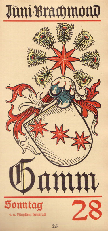 von Gamm In Silber drei rote, achtzackige Sterne schrägbalkenweise, auf dem ungekrönten Helm mit silbern-roten Decken ein achtzackiger roter Stern, an den sieben freien Spitzen je mit einer Pfauenfeder besteckt. |