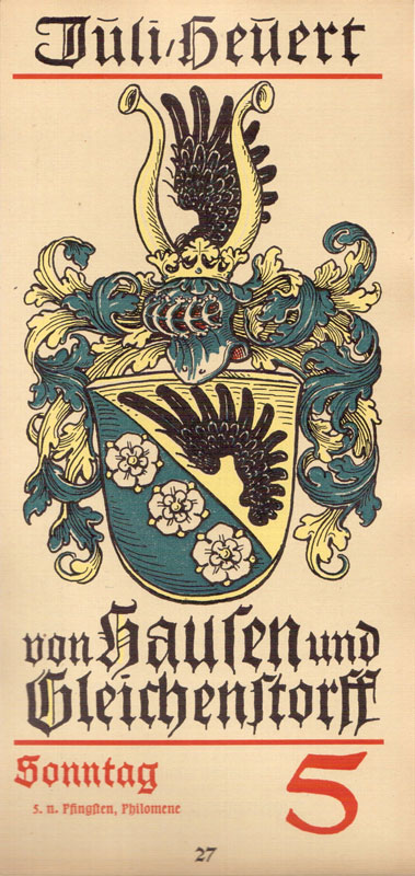 und Gleichenstorff Von Gold und Blau schräggeteilt, oben ein nach der Figur gelegter schwarzer Flügel, unten drei schrägbalkenweise gestellte silberne, golden bebutzte Rosen mit goldenen Kelchblättern, auf dem gekrönten Helm mit blau-goldenen Decken ein schwarzer Flügel zwischen zwei goldenen Büffelhörnern. |