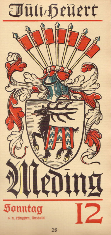 von Meding In Silber ein schreitender schwarzer, rotgezungter Hirsch mit goldenen Hufen, auf dem Rücken eine herabhängende Decke mit roten Streifen und blau-silbernem Muster dazwischen, auf dem rot-silbern bewulsteten Helm mit rot-silbernen Decken fächerförmig sieben rote Fähnchen an goldenen Stangen. |
