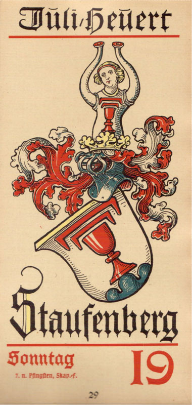 Staufenberg In Silber über einem blauen Dreiberg ein roter Pokal oder Meßkelch, von zwei roten Patenen überhöht, die untere kleiner, die obere größer, beide schwebend, auf dem Helm ein wachsender Jungfrauenrumpf mit goldenem Haar, anstelle der Arme zwei Büffelhörner, das silberne Gewand belegt mit einem rotem Pokal oder Meßkelch, von zwei roten Patenen überhöht. |