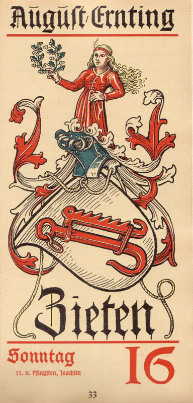| von Zieten In Silber ein schräggestellter, roter, höhenverstellbarer Kesselhaken mit Zahnschiene, auf dem ungekrönten Helm mit rot-silbernen Deckeneine wachsende Jungfrau mit offenem goldenem Haar, rotem Gewand und ebensolchem Haarband, in der ausgestreckten Rechten zwei grüne Eichenzweige mit goldenen Früchten haltend, die Linke eingestemmt. |