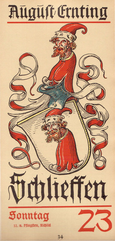 Schlieffen In Silber ein rotgekleideter Mannesrumpf mit hermelingestülpter roter Spitzmütze, auf dem ungekrönten Helm mit rot-silbernen Decken das Schildbild wachsend. |