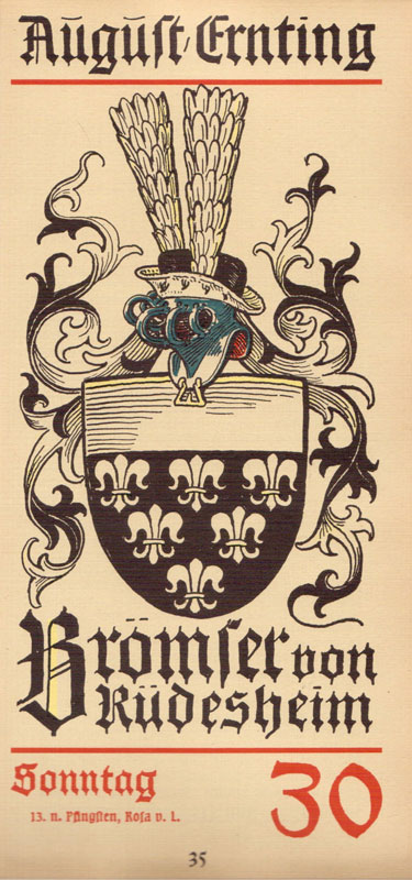 Rüdesheim Unter einem silbernen Schildhaupt in Schwarz sechs (3:2:1) silberne Lilien, auf dem Helm mit schwarz-silbernen Decken ein schwarzer Hut, in dessen Hermelinstulp zwei silberne Federstöße stecken. |