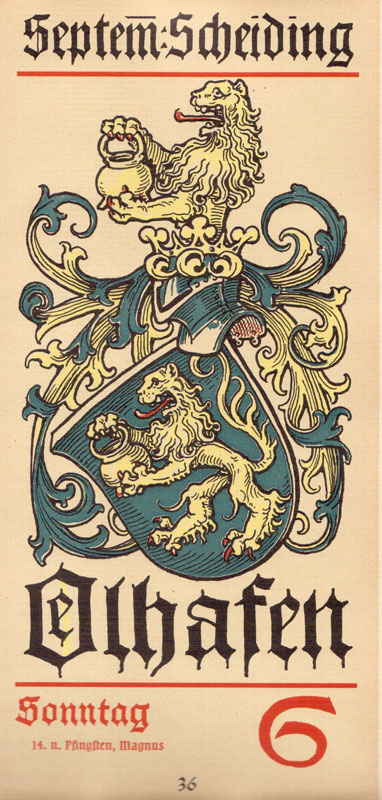 Oelhafen In Blau ein goldener, rotgezungter und ebenso bewehrter Löwe, der einen goldenen Öltopf in den Vorderpranken hält, auf dem gekrönten Helm mit blau-goldenen Decken der goldene Löwe mit dem Öltopf wachsend. |