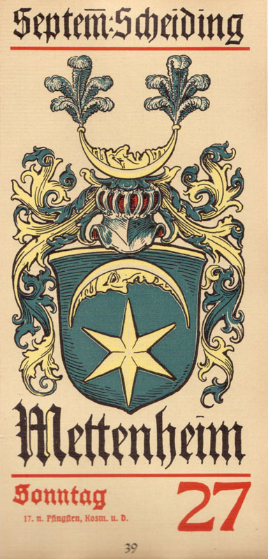 Mettenheim In Blau eine gestürzte (mit den Spitzen nach unten gerichtete) gesichtete goldene Mondsichel über einem sechszackigen goldenen Stern, auf dem ungekrönten Helm mit blau-goldenen Decken eine liegende (mit den Spitzen nach oben gerichtete) gesichtete Mondsichel, an den Spitzen jeweils mit einem Busch aus fünf blauen Straußenfedern besteckt. |