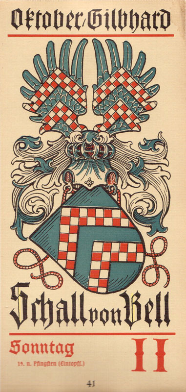 Bell In Blau zwei silbern-rot in zwei Reihen geschachte Sparren, auf dem ungekrönten Helm mit blau-silbernen Decken ein blauer Flug, jeder Flügel belegt mit den zwei silbern-rot in zwei Reihen geschachten Sparren. |