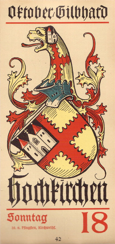 Hochkirchen In Gold ein rotes, gedorntes Kreuz, in einem schwarzen rechten oberen Freiviertel eine silberne Kirche mit zwei Türmen, die ein rotes Spitzdach tragen, dazwischen die Front des Kirchenschiffs mit einem Kreuz auf der Spitze, auf dem ungekrönten Helm mit golden-roten Decken ein wachsender, rotgezungter, goldener Brackenrumpf mit dem gedornten roten Kreuz auf dem Hals, das schwarze Ohr belegt mit der Kirche. |
