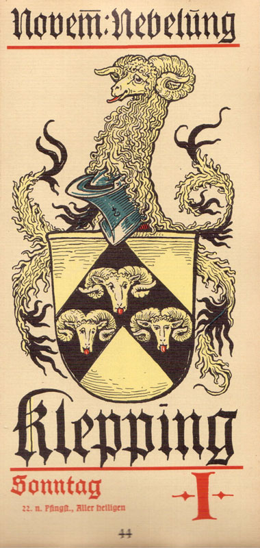 von Klepping In Gold ein schwarzer Sparren, belegt mit drei goldenen, vorwärtsgekehrten Widderköpfen, auf dem ungekrönten Helm mit golden-schwarzen Decken ein wachsender goldener Widderkopf mit Hals. |