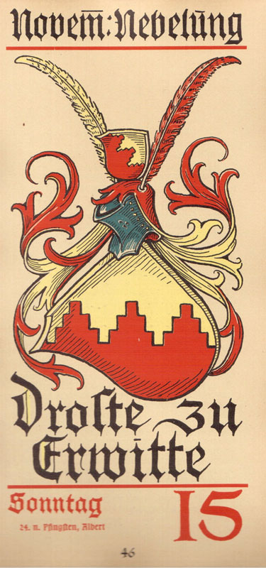 Erwitte Im doppelten Gegenstufenschnitt von Gold und Rot schrägrechts geteilt, jede der drei Treppen mit drei auf- und drei absteigenden Stufen, auf dem ungekrönten Helm mit rot-goldenen Decken der Schild zwischen einer goldenen und einer roten Fasanenfeder. |