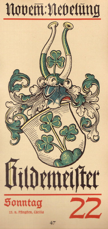 | Gildemeister In Silber auf einem grünen Dreiberg drei grüne, gestielte Waldkleeblätter, auf dem ungekrönten Helm mit grün-silbernen Decken ein gestieltes grünes Waldkleeblatt zwischen zwei silbern-grün übereck geteilten Büffelhörnern. |