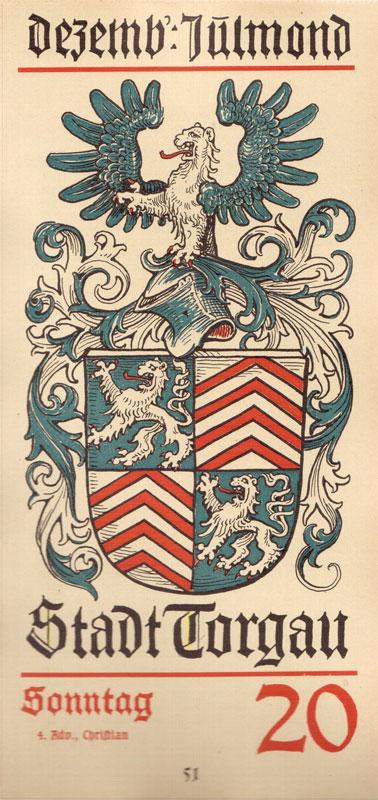 | Stadt Torgau Geviert, Feld 1 und 4: in Blau ein silberner, rotgezungter und ebenso bewehrter Löwe, Feld 2 und 3: in Silber vier rote Sparren, auf dem ungekrönten Helm mit blau-silbernen Decken ein silberner, rotgezungter und ebenso bewehrter Löwe wachsend zwischen einem blauen Flug. |