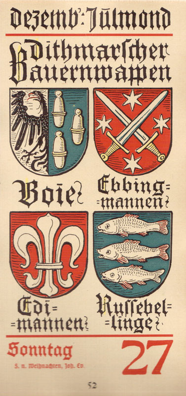 Bauernwappen Boie: Gespalten, rechts in Silber ein halber schwarzer Adler am Spalt, links in Blau drei silberne Bojen. Ebbingmannen: In Rot zwei schräggekreuzte silberne Schwerter mit goldenem Griff, bewinkelt von vier (1:2:1) silbernen sechszackigen Sternen. Edimannen: In Rot eine silberne Lilie. Russebellinge: In Blau drei silberne Fische (Karpfen) übereinander. |
