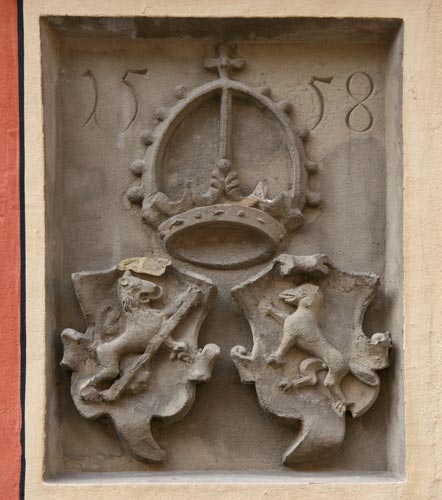Innenhof aufgestellter Wappenstein, von den