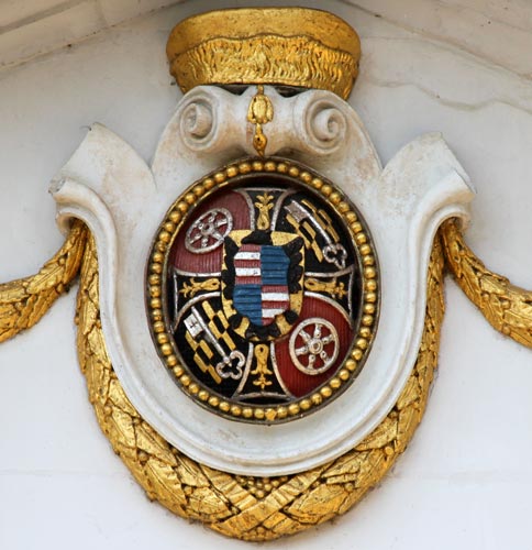 Das war wieder so ein "Ämter-Sammler" auf dem Mainzer Bischofsstuhl: Breslau (1683-1732), Worms (1694-1732), Fürstpropst von Ellwangen (1694-1732), Trier (1716-1729), später Mainz (1729-1732)- kaum zu glauben, daß er alle Ämter tatsächlich nicht nur innehatte, sondern auch ausübte. Und weil das anscheinend noch nicht genug war, kam noch die Würde des Hoch- und Deutschmeisters des Deutschen Ordens hinzu. Vielbeschäftigter Mann, bei dem man annehmen muß, daß seine Wappen eine höhere Präsenz zeigten als seine Person. Als Mainzer Fürsterzbischof hat er also alles im Wappen, was er im Laufe seines Lebens gesammelt hat, bis auf die Komponenten Trier und das damit verbundene Prüm, da er Trier für das reichspolitisch bedeutsamere Bistum Mainz aufgab.