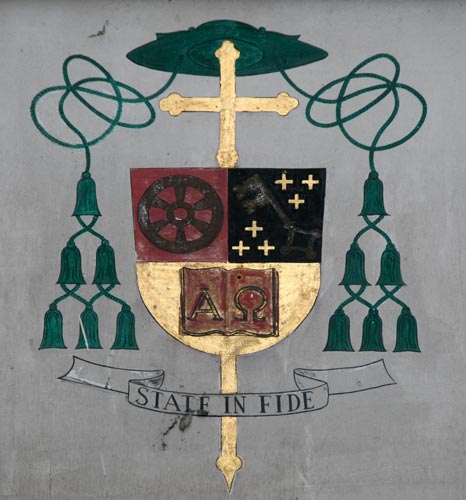 Geb. 21.1.1829, amtierte als Mainzer Bischof 1886-2.11.1899. Paul Leopold Haffner, der "schwäbische Philosoph auf dem Bischofsthron", stammte aus Horb und studierte im nahen Tübingen. 1855 kam er nach Mainz als Professor der Philosophie, zuvor war er Repetent am Wilhelmsstift in Tübingen. Das Bischofsamt übernahm er nach einer Zeit der Sedisvakanz wegen des Kulturkampfes. Er galt als engagierter und bisweilen auch kämpferischer Bischof, der auch Mitbegründer der "Görres-Gesellschaft zur Pflege der katholischen Wissenschaften" war. Sein Wappen ist geviert mit Herzschild und folgt klassischen Gestaltungsprinzipien: