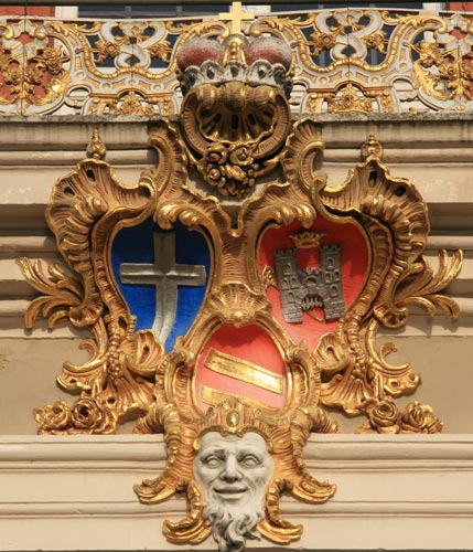 Das gartenseitige Hutten-Wappen am Corps de Logis, Schloß Bruchsal, unter der Altan-Brüstung.